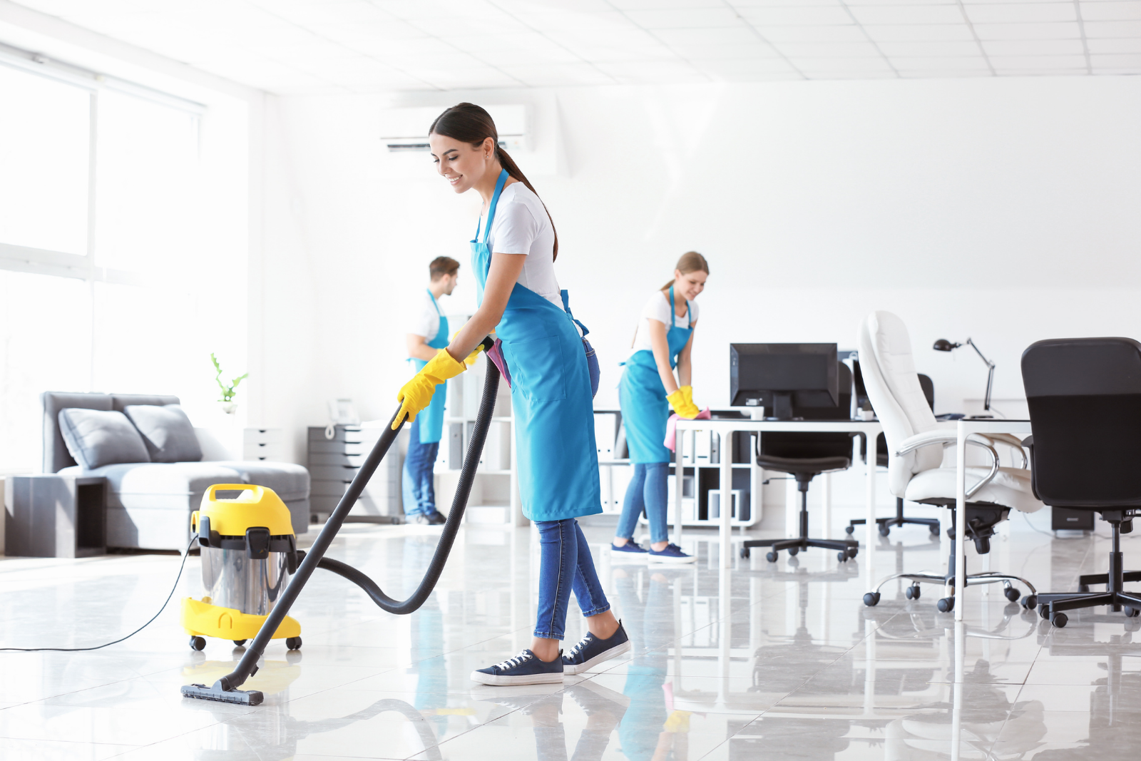 Vacuum carpets, mop floors, and clean lobbies, corridors, and shared spaces.